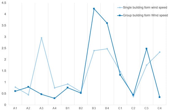 Under the group combination of buildings, the wind environment is compared, and the placement of the measuring sites is also specified in the group simulation in order to further assess how the group combination has affected the Areia Preta high−rise building. At sites A3, B3, B4, and C4, the study found that the differences in wind speed between the group simulation and the individual simulation are relatively considerable (Figure 8). The building corner is something that all of these sites have in common. This corner is made when the buildings in a group work together, which is very different from the simulation of a single building (refer to Appendix B for the detailed simulation experiment process). The arrangement of building groups has a significant impact on the wind field distribution. Comparing the individual wind fields reveals that the wind speed increases significantly at the corners of the U−shaped aircraft hangar on both sides. Affected by neighboring buildings and street space, it is approximately 0.5–1 times larger than when it exists on its own (red circle in Figure 9). When carrying out urban design, consideration must be given to the increase in wind speed at the corners of the windward side of high−rise buildings, especially if there are other high−rise buildings on both sides, as the wind speed increase multiplier will be greater than 0.5. The shading between buildings decreases ventilation in areas that would otherwise have it. The L−shaped slab building is located within the building complex, and the majority of it is in the wind shadow area of the front row of buildings when it is obstructed by the front row of buildings. The wind velocity is less than that of the single−body simulation, which accentuates the phenomenon of stillness and absence of wind in the enclosed space (Figure 9, white circle). As the building’s corner unit, A3 has a good ventilation effect, and the wind speed is approximately one-sixth that of a single unit due to the front row’s shading (Figure 9, the black connection). The interaction between single buildings also affects point-type single buildings. The distance between point−type buildings is small, the flow effect of the surrounding wind field is less than that of the single-body simulation, and the wind speed at the corner is approximately one−fifth of its original value (Figure 9, the red connection).