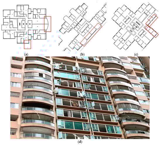 Locations vulnerable to typhoon damage in the standard layer plane. (a) Villa de Mer standard floor; (b) La Baie du Noble standard floor; (c) EDF. Polytec Garden standard floor; and (d) Damage to the facade windows of La Baie du Noble after Typhoon Hato. In the floor plan (a–c), the Chinese text indicates the location of the elevator room of the residence.