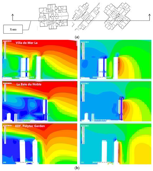 This study examines the simulated values of high-rise buildings in extreme typhoon conditions using the PHOENICS software. Consistent with the previous section, it mainly discusses three residential areas on the windward side, namely, Villa de Mer, La Baie du Noble, and EDF. Polytec Garden. Figure 11a shows how to look at the X-axis slices of the buildings in each residential area and analyze the wind speed and wind pressure vector conditions inside the buildings.