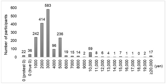 Although many WTP studies have reported on dental treatment [15,16,17,18,19,20], few have focused on receiving dental checkups [21,22]. A previous study [22] related to the results of this study showed that the WTP values for dental checkups were evaluated by targeting patients in dental clinics, with a median WTP value of 2000 yen (mean: 2252.6 yen) for regular visitors and a median WTP value of 2000 yen (mean: 2124.9 yen) for infrequent visitors. The results of this study were different from the findings of the previous study; however, they are not simply comparable because the previous study surveyed patients visiting dental clinics, whereas, in this study, the sample was recruited from the general population that approximates the Japanese population, using the quota sampling method and conducting a web-based survey. Therefore, the results of this study are the first to determine WTP values for dental checkups in the general population nationwide and can be expected to contribute to health policy planning.