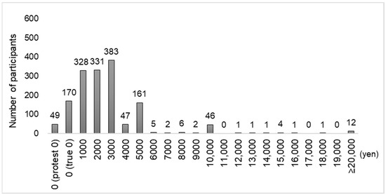 The study participants were presented with the following range of amounts for their responses: 0 yen, 1000 yen, 2000 yen, 3000 yen, 4000 yen, 5000 yen, 6000 yen, 7000 yen, 8000 yen, 9000 yen, 10,000 yen, 11,000 yen, 12,000 yen, 13,000 yen, 14,000 yen, 15,000 yen, 16,000 yen, 17,000 yen, 18,000 yen, 19,000 yen, and 20,000 yen or more (as of February 2023, 1000 yen = 7.5 USD). These ranges were set based on a previous study [22]. The questionnaire on WTP values for dental checkups was pretested before the actual survey was administered to the study participants.