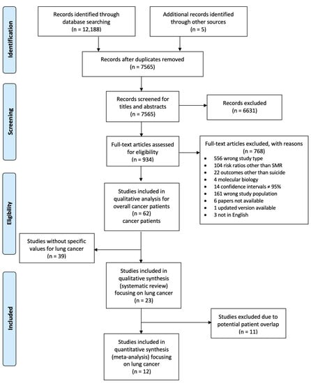 We retrieved 12,188 records from the electronic databases, with five studies being added through other sources. After deduplication, we screened 7565 publications for titles and abstracts. In a second step, full texts were screened. Among 62 studies on suicide in cancer patients, we found 23 studies that presented specific data on patients with lung cancer [6,7,8,9,10,11,12,16,30,31,32,33,34,35,36,37,38,39,40,41,42,43,44]. Whereas 12 studies provided data on 1,790,027 patients with lung cancer, 11 studies gave only numbers of lung cancer patients who committed suicide, or risk estimates for suicide, but not the total number of patients with lung cancer. During follow-up, 5498 patients with lung cancer committed suicide.