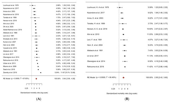 In all 23 studies, we found a significantly elevated risk of suicide in lung cancer patients compared to the general population (SMR = 3.54, 95% CI = 2.95–4.26, p-value < 0.0001; Figure 2A). After exclusion of studies with potential patient overlap, the suicide mortality risk was increased 2.95-fold compared to the general population (SMR = 2.95, 95% CI = 2.42–3.60, p-value < 0.0001; Figure 2B). Both analyses showed considerable heterogeneity among studies (I2 = 97.65% and 90.46%, both p-values for heterogeneity < 0.0001).
