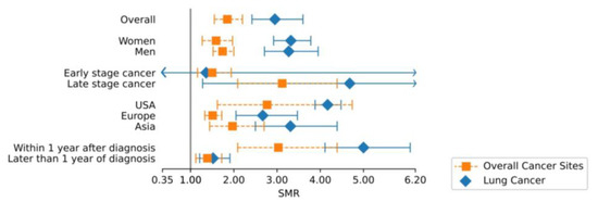 Comparison of overall and subgroup SMR of lung vs. all other cancer sites. Abbreviations: SMR, standardized mortality ratio; CI, confidence interval. Exact values of SMR and CI are indicated separately.
