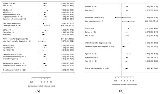 In further subgroup analyses, no statistically significant differences in suicide risk were observed (Figure 4B and Appendix B, Table 1). In all nine studies that stratified by gender, both men and women with lung cancer showed an elevated SMR for suicide compared to the general population (SMR for women = 3.32, 95% CI = 2.92–3.78; SMR for men = 3.27, 95% CI = 2.71–3.95). Age-specific differences were investigated in two studies [16,42]. Risk for suicide in patients with lung cancer was slightly increased across different ages at diagnosis (SMR for <60 years of age = 3.09, 95% CI = 2.46–3.88, SMR for 60–69 years of age = 3.23, 95% CI = 2.89–3.61, SMR for ≥70 years of age = 3.40, 95% CI = 1.70–6.79). For patients with lung cancer living in the USA, the most accentuated risk of suicide (SMR = 4.17, 95% CI = 3.88–4.48) was observed compared to those in Asia (SMR = 3.31, 95% CI = 2.50–4.39) or Europe (SMR = 2.67, 95% CI = 2.05–3.47). Patients with metastasized tumors were at elevated risk (SMR = 4.68, 95% CI = 1.28–17.14), whereas patients with a regional cancer stage showed a non-significantly lower SMR of 1.36 (95% CI = 0.24–7.76).