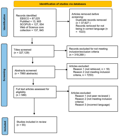 In this third stage, I reviewed titles, abstracts, and when relevant, the full-text papers. I included literature written in English and French, but articles in other languages were excluded as I could not translate them. For articles I could not access through my institution, but up-to-date contact details were available, I contacted the first author of the required paper to request a copy. Of the 20 authors contacted, two sent a copy of their article, with a cut-off date of 15 March 2022. Quantitative, qualitative, and mixed methods studies were included, provided they met the inclusion criteria. An external reviewer checked 15% of the papers to assess whether they would meet the inclusion/exclusion criteria with 55 articles included for the next stage. The review process is available at Figure 1.