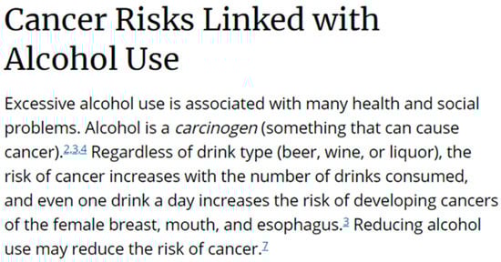- Centers for Disease Control and Prevention. Preventing Cancer by Reducing Excessive Alcohol Use. Available online: https://www.cdc.gov/cancer/alcohol/reducing-excessive-alcohol-use/index.htm (accessed on 10 February 2023).
