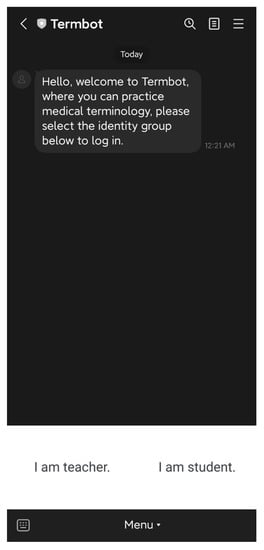 Figure 3 shows the initial screen of Termbot, where the user is prompted to select whether they are a teacher or a student. This selection will determine the different system functions that will be available to the user.