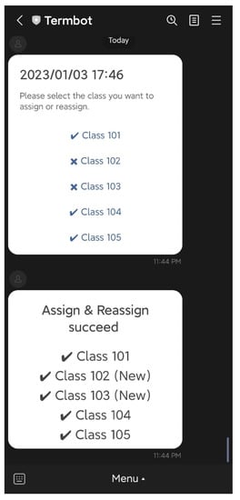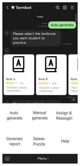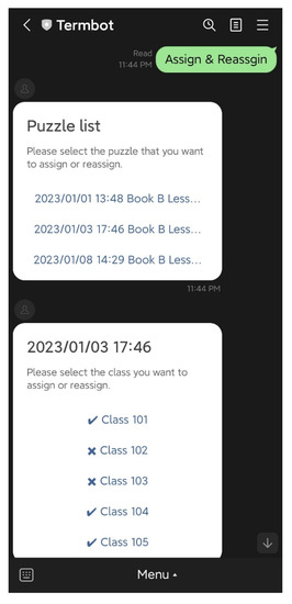 On the initial screen, the teacher has access to six main functions: “Auto-generate”, “Manual generate”, “Assign & Reassign”, “Generate report”, “Delete Puzzle”, and “Help”. The “Auto-generate” function enables teachers to select the textbook and lesson to be practiced by students, and the system will automatically generate the crossword puzzle questions and answers. The teacher then confirms the puzzle before sending it back to the students, as shown in Figure 7 and Figure 8. The “Manual generate” function allows teachers to add additional words or customize the puzzle by inputting words and related clues. The system will then automatically generate the crossword puzzle and send it back to the teacher for confirmation. The “Assign & Reassign” function allows teachers to assign crossword puzzles to other classes after creating them, as shown in Figure 9 and Figure 10. The “Generate report” function will produce a report of how many students have completed each crossword puzzle, their error rate, and other statistics. The “Delete Puzzle” function allows teachers to remove unwanted crossword puzzles. Lastly, the “Help” function provides instructions for using Termbot.