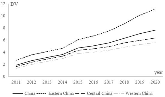 The results of the descriptive statistics for each variable are shown in Table 5, where the mean value of digital village construction is 4.724. Figure 1 shows the trend in the level of digital village construction, from which we found that the digital village construction index basically showed an increasing trend. From 2011 to 2020, the growth rate of China’s digital village construction level was 317.21%, with an average annual growth rate of 17.20%. By region, the level of digital village construction in the east, middle, and west maintained an upward trend, with average annual growth rates of 17.33%, 16.57%, and 17.49%, respectively, indicating that all regions in China have achieved certain results in the construction of digital villages. At the same time, there are obvious regional differences in the construction of digital villages. Figure 1 shows that the digital village construction level was higher in the eastern region than the national average in all years. The east was ahead of the central and western regions. Figure 2 shows that, no matter whether in 2011 or 2020, the areas with a high level of digital village construction are on the east coast, including Beijing, Tianjin, Jiangsu, Zhejiang, Fujian, and Guangdong. The second-tier provinces are mainly in the eastern and central regions, such as Hebei, Hubei, and Shandong. The construction level of digital villages in western China was generally low. Overall, the construction of digital villages in China presents the characteristics of “strong in the east, transitional in the middle and weak in the west”. The reasons for this feature are as follows: The eastern region has obvious resource advantages and policy dividends, and digital technology here sprouted early, developed rapidly, and penetrated into rural areas quickly, thus taking the lead in the construction of China’s digital villages. However, capital, technology, talent, and other resources in the western region are insufficient, so the foundation for digital village construction is lacking.