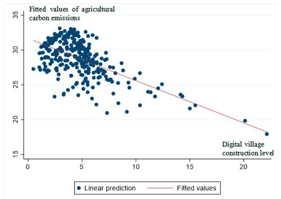 In Table 6, the results of the Wald test indicate that the explanatory power of the model is strong (the random effects model uses maximum likelihood estimation (MLE), so the Wald test is used to judge the significance of the model. When the Wald statistic is greater than the critical value and the corresponding probability value is lower than the given significance level, the model is considered to have a strong explanatory power). Columns (1) and (2) show the regression results for the uncontrolled years. Based on the results of data regression, we found that the level of digital village construction was significant at the 1% level with negative values, regardless of whether control variables were included, which indicated that digital village construction reduced agricultural carbon emissions. Columns (3) and (4) provide the regression results with the addition of annual control variables. Column (3) is significant at the 5% level and has a negative value for the level of digital village construction when no control variables are included. Column (4) is significant at the 1% level of significance and has a negative value for the level of digital village construction after the inclusion of control variables. For every one-unit increase in the level of digital village construction, agricultural carbon emissions are reduced by 0.291 million tonnes, which proves that digital village construction has promoted the reduction of agricultural carbon emissions. The construction of digital villages stimulated the subjective will of agricultural producers to engage in green practices through access to information dividends. Digital village construction simultaneously enabled the rapid dissemination of knowledge through the Internet and mobile device terminals and promoted the mastery of the latest production techniques by agricultural producers. Additionally, digital village construction enabled technological advances to be used to promote technological innovation in green agricultural production. Figure 3 shows the fitted line graph after regression, indicating that digital village construction does have a negative effect on agricultural carbon emissions. Therefore, H1 was supported.