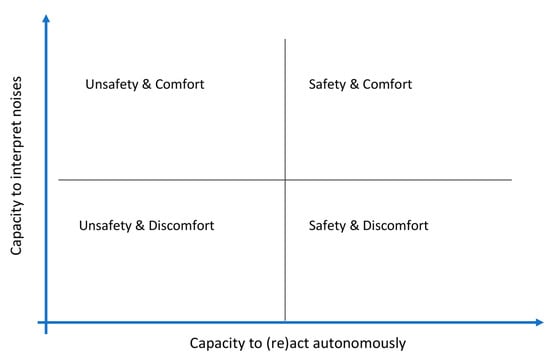 In conclusion, the emergence and progression of CB are highly individual (relying on personality and characteristics of dementia) and depend on the interaction between persons and the acoustic environment. The influence of sounds on the behavior and QoL of PwD was subject to two dimensions: (1) the ability to correctly interpret the sound and (2) the ability to react to it adequately. These two dimensions were interrelated and led to four different types: the PwD (1) who can interpret correctly and react adequately, (2) who can interpret correctly but cannot react adequately, (3) who cannot interpret correctly but reacts adequately and (4) who cannot interpret correctly and cannot react adequately. Four personae emerged from the qualitative data (Figure 1), offering opportunities to understand the PwD’s reactions to the sonic environment and develop adequate soundscapes.