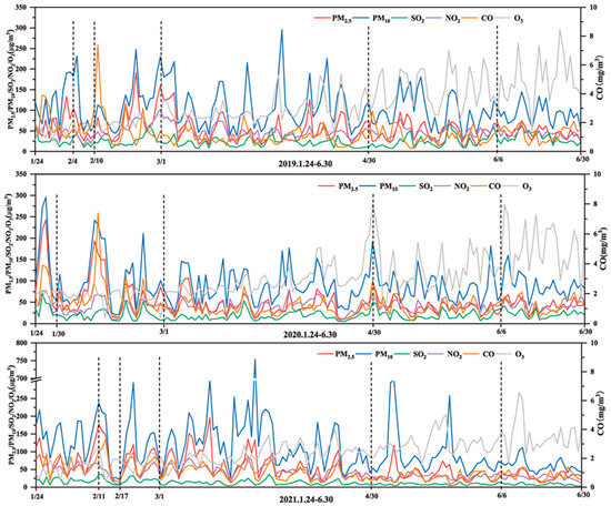 Variation in the daily average concentrations of pollutants from 24 January to 30 June for the 2019–2021 period.