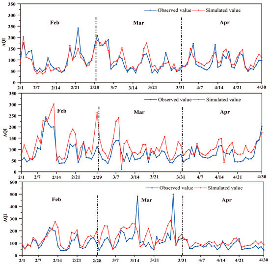The model simulation results for February, March, and April 2019–2021 are shown in Figure 5. In 2019 (the year without COVID-19), the simulated monthly average values of AQI for the three months were 88.52 µg/m3, 100.23 µg/m3, and 99.66 µg/m3, respectively, and compared to them, the observed values increased by 12.54% for February, and decreased by 8.83% and 11.73% for March and April, respectively. In 2020, the observed monthly average values in February, March, and April were 96.79 µg/m3, 73.19 µg/m3, and 80.50 µg/m3, respectively, of AQI, while the simulated values were 136.45 µg/m3, 106.74 µg/m3, and 100.68 µg/m3, respectively. Therefore, the reduction in AQI caused by COVID-19 control measures in February, March, and April during the Level I response in 2020 were estimated at approximately 29.07%, 31.43%, and 20.04%, respectively. The reduction in February, March, and April during the Level III response in 2021 were estimated at approximately 20.68%, 18.37% and 22.04%, respectively.