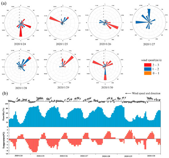 Daily and hourly changes in meteorological elements during the Spring Festival in 2020. (a) Daily wind rose diagram. (b) Hourly changes in temperature, humidity, wind speed, and direction (the direction of the arrow represents the wind direction, and the length of the arrow represents the wind speed).