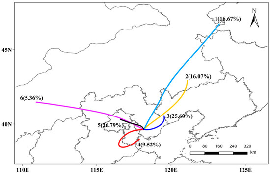 This section simulated the backward trajectory of air masses from 0:00 on 24 January to 23:00 on 30 January 2020, and identified possible transport routes for pollutants through cluster analysis. Through the total spatial variance analysis, all backward trajectories could be aggregated into six categories (Figure 7). The trajectory-3 from Qinhuangdao–Tangshan and the trajectory-5 from Beijing–Tianjin corresponded to air masses with a short-distance transport and accounted for 25.60% and 26.79% of the total trajectories, respectively. These air masses move slowly, which is not conducive to the diffusion of pollutants, and they are the most likely to carry the pollution to the receiving point. In contrast, the trajectory-1 from the northeastern region and the trajectory-6 from central Inner Mongolia corresponded to air masses with long-distance transport and accounted for 16.67% and 5.36% of the total trajectories, respectively. Due to their high speed and low possibility of occurrence, this type of air mass may have little effect on pollutant concentration in Tangshan.