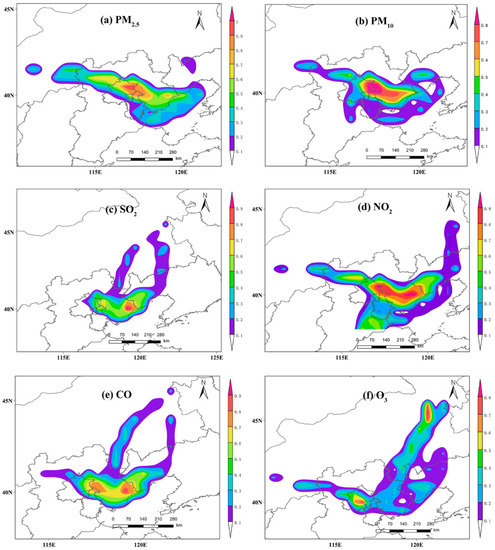 Based on the analysis of the transportation path, PSCF analysis was used to determine the main potential areas representing pollution sources (Figure 8). The results showed that local emissions and short-distance transportation were the main sources of air pollution in Tangshan. The main potential sources of PM2.5 and PM10 were located in the northern parts of Beijing and Tianjin, and this is specifically related to the increase in particulate matter concentration caused by the frequent occurrence of sandstorms in Beijing in winter and spring [60]. The main potential sources of SO2 and CO were located in Tangshan and Qinhuangdao, which were the leading cities in terms of growth rates of the industrial output value in Hebei Province in 2020, and the main sources of the two above-mentioned pollutants were the industries producing steel, energy, glass, and building materials. As an important indicator to evaluate the contribution of mobile sources, the potential sources of NO2 were mainly distributed between Beijing and Tangshan, suggesting that high-intensity anthropogenic activities may occur in these areas [61]. Affected by the northerly winter wind during the East Asian monsoon, O3 and its precursors from the cold inland part of northern China were transmitted to Tangshan through long-distance transportation [62].