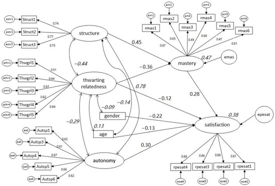Then, a model investigating the mediating role of perceived mastery climate assessed through PETEG was constructed. Initially it was assumed that perceived autonomy, structure, and thwarting relationships would have both direct and indirect effects on satisfaction through perceptions of mastery. As shown in Figure 1, after retaining only the paths with significant effects, controlling for age and gender, the effect of structure on satisfaction was fully mediated through perceived mastery; autonomy had only direct effect on satisfaction, while the negative effects of thwarting relationships were both direct and indirect through perceptions of mastery.