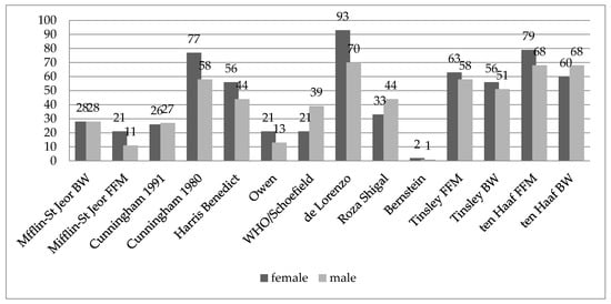 Percentage of studied equations overlapping by ±10% with IC measurement results for female group and male group.