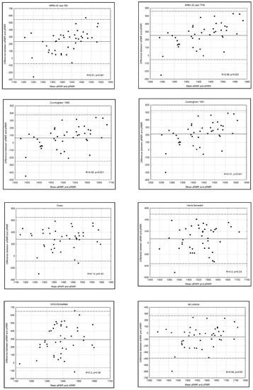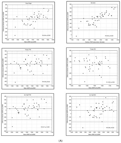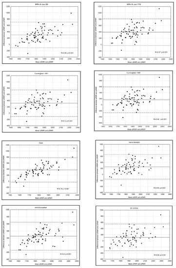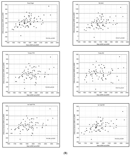 The majority of predictive equations in the Bland–Altman tests that are presented in Figure 2 demonstrated a high correlation coefficient, which implied a steadily increasing predictive equation error when RMR increased. In the group of women, we obtained favorable results with the De Lorenzo equation, which showed a small scatter of results and a difference between the mean measurement and the equation result (−60 kcal), as well as a low correlation coefficient (R = 0.33). Among equations with a small difference, Bland–Altman tests demonstrated a large scatter of results, even for the equations for which ±10% RMR correlation was about 70%, and ICC indicated their low reliability.