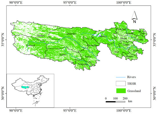 The Three-River Headwaters Region (TRHR) is the source of the Yangtze River, the Yellow River, and the Lancang River. Located in the southern part of Qinghai Province, it is a veritable “Chinese Water Tower” (Figure 1). It is a sensitive area and an important starting area for global climate change. It is one of the most sensitive and fragile ecosystems, and crucial to the sustainable development of Southeast Asian countries [1,2]. It also occupies a special position in Chinese animal husbandry [3]. Grassland is the most dominant type of cover in TRHR and provides the most ecosystem services [4].