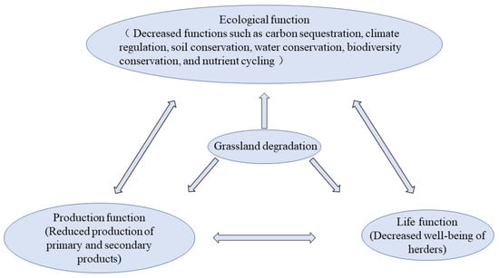 Grassland degradation reduces vegetation cover, height, and productivity, changes in grassland community composition, and allows the invasion of noxious weeds, all of which undermine grassland ecological sustainability [66]. From a production point of view, grassland degradation will undoubtedly impair the yields of primary products (grass, medicinal materials, fungi, and fuel) and secondary products (milk, meat, hair, and hides). From the perspective of the herders’ livelihood, grassland degradation has reduced their well-being, resulting in the emergence of many ecological refugees [58] (Figure 2).
