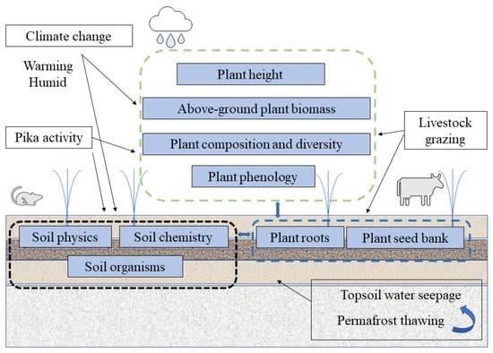 Many differences still need to be unified in the understanding of the driving mechanism and response consequences of the TRHR alpine grassland ecosystem. Furthermore, there are many uncertainties in future climate change, which also increases the complexity. Future research should aim at a more comprehensive, clearer understanding of the driving mechanisms and response consequences, as this should be an effective means for us to deal with future risks. Sufficient systems knowledge to underpin future grassland conservation, which requires more on-site ecosystem-level studies, is still lacking. Remote sensing is an important method for monitoring vegetation and land, and related studies are many [133]. However, due to the complexity of ecosystem processes and the limitations of remote sensing data, its full potential has not been realized, and data fusion methods should be used to overcome these limitations further [134]. Therefore, the combination of field experiments and modeling will be an important direction for future research.