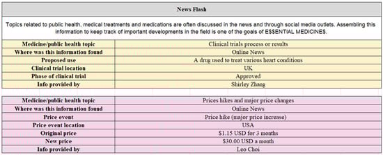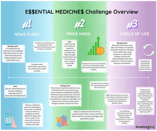 E$$ENTIAL MEDICINE$ (E$$; See—https://www.breakinggoodproject.com/essentialmedicines accessed on 20 January 2023) is a citizen science project with the objective to better understand accessibility to essential medicines and identify attributes that contribute to their inaccessibility []. This is achieved by engaging volunteers in online searches to locate relevant information about essential medicines, scaffolded across three challenges designed by the E$$ team. The data collected by citizens contributes to the creation of an open database which aims to bring to light trends that lead to the inaccessibility of a medicine and identify medicines at risk of becoming inaccessible before it occurs. The database is an open tool we hope will support informed decision making by researchers, policy makers, patients, and other interested parties.