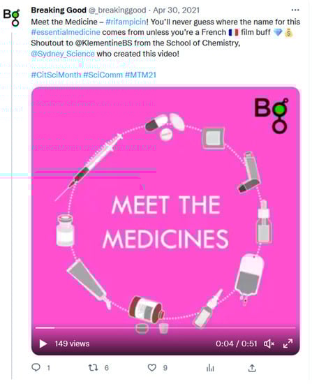Published tweet for rifampicin video. See—https://twitter.com/_breakinggood/status/1387997091641794562?s=42&t=YQlFlekFEt9A3UK_zaUFRg, accessed on 20 January 2023.