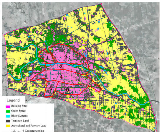Urban rainfall surface runoff is mainly influenced by the intensity of rainfall and the subsurface. Using a combination of field surveys, large-scale topographic maps, and high-resolution remote sensing images to analyze the subsurface within the planning area and comprehensively analyze the types of water bodies, grass, woods, bare soil, roads, squares, and roofs and paving in small areas allowed for subsurfaces in the central city of Zhoukou to be classified into five major categories: river systems, green space, transport land, building sites, and agricultural and forestry land. For details, see Figure 2 and Table 1.