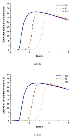 The waterlogging situation in the study area can be expressed in terms of the total amount of waterlogging. The total amount of water accumulated at each ponding point in the study area was superimposed to obtain the total amount of water accumulated in the area, and the process of calculating the total amount of water accumulated for each rainfall type at different return periods is shown in Figure 5. A comparison of the peak amounts of water accumulated at different return periods is shown in Table 3. As can be seen from Figure 5 and Table 3, when the return period is less than 20 years, the Chicago design rainstorm with a peak ratio of r = 0.25 is the most severe. For example, for a return period of 10 years, the total peak ponding volume for a peak ratio of r = 0.5 is 187,800 m3, a reduction of 1287 m3 from the peak ratio of r = 0.25; the total peak ponding volume for a peak ratio of r = 0.75 is 186,400 m3, a reduction of 1300 m3 from the peak ratio of r = 0.5. When the return period is higher than 20 years, a peak ratio of r = 0.75 produces a higher peak inundation than a single-peaked rainfall with r = 0.25. However, as the intensity of precipitation increases, the difference in peak inundation due to the difference in peak coefficients decreases. For example, for a 50-year return period, a rainfall with a peak ratio of r = 0.75 produces 4010 m3 more rainfall than a rainfall with r = 0.25. For a 100-year return period, a peak ratio of r = 0.75 provides 2962 m3 more rainfall than a peak ratio of r = 0.25.