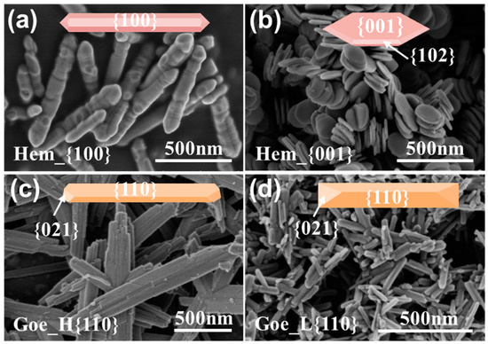 XRD analysis was applied to confirm the iron oxide nanomaterial crystallographic structure and phase purity. As shown in Figure S1a–c, the results confirmed that the synthetic powders could be assigned to hematite α-Fe2O3 (JCPDS No. 33-0664) and goethite α-FeOOH (JCPDS No. 29-0713), respectively, with pure crystalline phases and high crystallinity [11,16,17]. The crystallinity of Hem_{100}, Hem_{001}, Goe_H{110}, and Goe_L{110} were calculated to be 52.69, 51.30, 42.98, and 48.48%, respectively, indicating that hematite had a slightly higher crystallinity than goethite. The SEM images showed that Hem_{100} was hexagonal prisms with an average length of 750 nm and a mean width of 120 nm, while Hem_{001} was hexagonal plates with a mean length of 180 nm and an average thickness of 20 nm (Figure 1a,b and Table S1). The nanoparticles synthesized in the experiment were consistent with the regular morphology of the corresponding single crystal. Moreover, the morphology of Goe_H{110} was bamboo-strip-like nanoneedles with an average length of 1300 nm and a mean width of 215 nm, while that of Goe_L{110} was nanorods with an average length of 120 nm and a mean width of 35 nm (Figure 1c,d and Table S1). Moreover, according to previous studies [11,16], the dominant exposed surface of Hem_{100} were {100} facets (about 94.0%), whereas that of Hem_{001} were {001} facets (about 85.5%). The exposed facets of Goe_H{110} were composed of approximately 98.5 {110} and 1.5% {021}, while that of Goe_L{110} were composed of approximately 82.3 {110} and 17.7% {021}. The BET surface area of Hem_{100}, Hem_{001}, Goe_H{110}, and Goe_L{110} were 8.04, 24.59, 66.88, and 76.01 m2 g, respectively, as determined using a N2 adsorption-desorption measurement (Table S1).