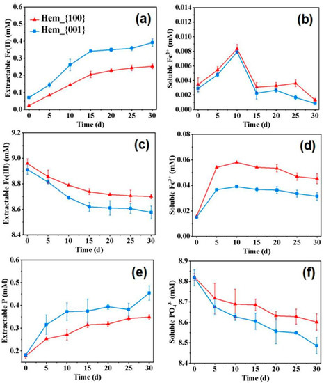 In all systems, the concentration of reduced soluble Fe2+ remained around the range of 0–0.01 mmol L−1, indicating that Fe2+ did not accumulate in the system, which was mainly due to Fe2+ being quickly converted to other forms (Figure 3b and Figure S4b) [2]. In 0–10 days, the Fe3+ concentration increased rapidly and then decreased slightly due to the dissolution of iron oxide. It may be because the iron oxide minerals were partially dissolved under the action of microorganisms, in which Fe3+ was reduced to Fe2+. Fe2+ was further combined with PO43− to form Fe(II)-p precipitation (Figure 3d and Figure S4d) [2]. During the microbial dissimilatory iron reduction process in all systems, Fe(II) was released from the iron oxides and immediately reprecipitated with PO43− [27], resulting in a decrease in the concentration of PO43− (Figure 3f and Figure S4f) and an increase in the content of extractable P (Figure 3e and Figure S4e). After 30 days, the P content of Hem_{100} and Hem_{001} was 0.35 ± 0.01 mmol L−1 and 0.45 ± 0.03 mmol L−1, respectively (Figure 3e), while that of Goe_H{110} and Goe_L{110} was 1.18 ± 0.13 mmol L−1 and 0.76 ± 0.10 mmol L−1, respectively (Figure S4e). The continual and smooth increase in the solid phase Fe(II) and P indicated that vivianite was constantly accumulated. The final Rp of Hem_{100} and Hem_{001} was about 3.95 and 5.15%, respectively, while that of Goe_H{110} and Goe_L{110} was about 13.63 and 8.65%, respectively (Figure S5). Correspondingly, the Rv of Hem_{100}, Hem_{001}, Goe_H{110}, and Goe_L{110} was about 1.88, 2.90, 10.78, and 9.81%, respectively (Figure S5). The highest vivianite formation efficiency was obtained in the hematite system with predominantly exposed {001} facet and the goethite system with high contents of exposed {110} facet [28]. Compared with Hem_{100}, Hem_{001} was more easily dissolved by G. sulfurreducens, which could produce more Fe(II) to combine with PO43− and promote the formation of more phosphorus crystal products. In addition, studies showed that different crystal faces would affect the type and abundance of surface iron atoms and the number of surface active groups due to the different arrangement of atoms [29]. It was reported that the adsorption affinity of orthophosphate ions and iron oxides was closely related to the number of -FeOH groups on the surface [30], while previous studies showed that the density of -FeOH groups on the {001} surface of hematite was significantly higher than that on the {100} surface, which may be the reason for the higher phosphorus recovery of Hem_{001} [16]. In addition, the {110} surface of goethite was the dominant plane for phosphate adsorption [1], so the high proportion of the {110} surface of goethite may contain a higher density of -FeOH groups, which was more conducive to promoting the formation of phosphorus crystallization products.