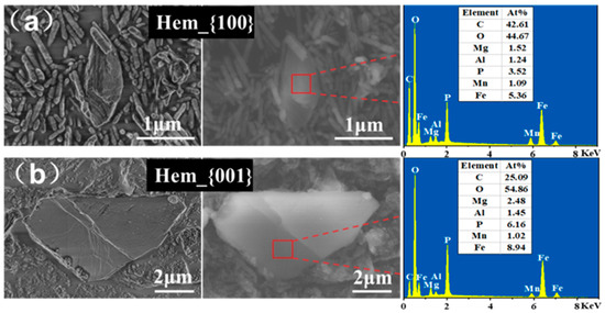 SEM image of vivianite in Hem_{100} (a) and Hem_{001} (b) systems and the corresponding EDS patterns.