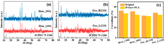 X-ray diffraction (XRD) patterns of phosphorus crystalline products collected 30 days after inoculation of (a) hematite and (b) goethite nanoparticles and (c) the crystallinity statistics. Experimental conditions: hydrophosphate-buffered (9 mM); Geobacter sulfurreducens (OD600 ≈ 0.30); iron oxide nanocrystals (9 mM).