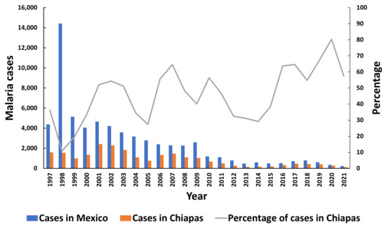 Number of malaria cases reported per year from 1997 to 2021 in Mexico (blue bars), and in Chiapas (red bars). The gray line represents the proportion of cases in Chiapas over the total number of cases in the country over a period of 24 years. Data obtained from the page of the Ministry of Health of the epidemiological bulletin https://www.gob.mx/salud/acciones-y-programas/historico-boletin-epidemiologico (accessed on 18 November 2022).