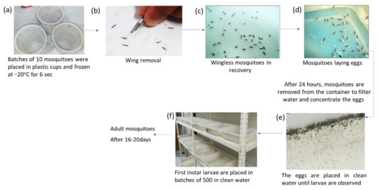 Procedure for forced oviposition of Anopheles albimanus under insectary conditions at the Centro de Investigación en Salud Pública, Instituto Nacional de Salud Pública, México. (a) Batches of 10 mosquitoes were placed in plastic cups and frozen at −20 °C for 6 s, (b) Wing removal, (c) Wingless mosquitoes in recovery, (d) Mosquitoes laying eggs, (e) The eggs are placed in clean water until larvae are observed, (f) First instar larvae are placed in batches of 500 in clean water.