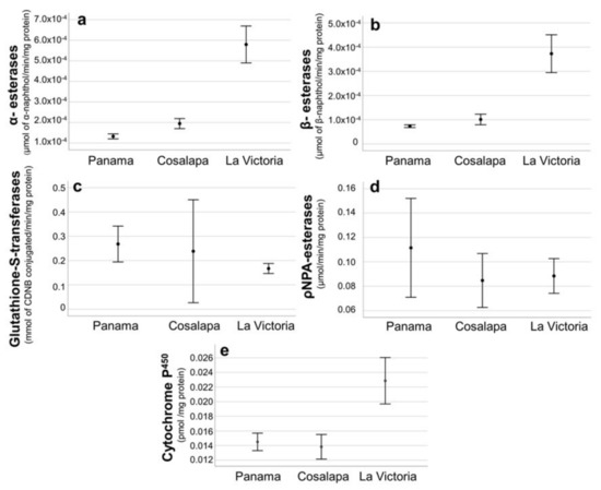 The enzymes responsible for carrying out the detoxification of xenobiotics in organisms are synthesized by large families of genes [21]. Among the enzymes that metabolize insecticides are esterases, GSTs, and cytochromes P450, which could act together to metabolize large insecticide molecules. One of the most common mechanisms used to achieve this is overproduction; thus, they can metabolize or trap significant amounts of insecticide molecules to prevent them from reaching their site of action. To determine if the resistance of mosquitoes to insecticides is explained by the high levels of enzymes metabolizing insecticides, frozen F1 female mosquitoes from Cosalapa and La Victoria were processed by biochemical assays according to Penilla [14]. Each biochemical assay was repeated twice, with sets of 47 mosquitoes per village and per assay. A total of 94 mosquitoes per village were analyzed. If the results of a test were unreliable, they were excluded from the analysis.