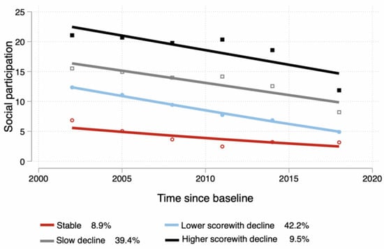The following supporting information can be downloaded at: https://www.mdpi.com/article/10.3390/ijerph20054260/s1, Figure S1: Trajectories in social participation—Sensitivity analyses (n = 704); Table S1: Baseline characteristics of the total sample between extracted and included participants.