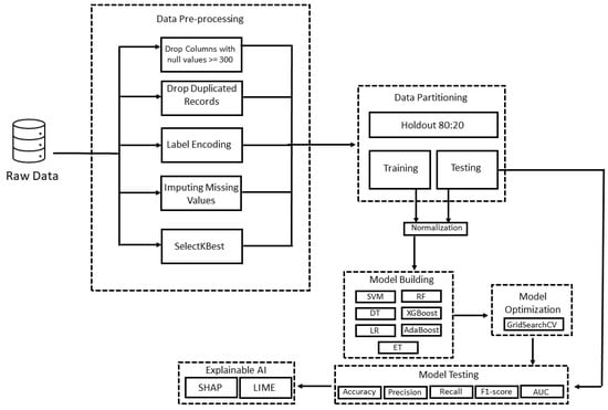 This study developed a pre-emptive model for diagnosing MS using Python programming language. A fixed seed value of 0 was set throughout all operations. Before modeling, the dataset was subjected to various pre-processing techniques, as shown in Figure 1. The SelectKBest technique with the chi-squared test and k = 11 was used to extract the best features. Additionally, the dataset was split into stratified proportions, where 80% of the data were reserved for training and were further validated using stratified 10-fold cross-validation, whereas the rest were used for testing the proposed models. The min–max scaler was then fitted to the training set and transformed into the testing set. Furthermore, seven ML algorithms were trained with the selected 11 features: SVM, DT, LR, RF, XGBoost, AdaBoost, and ET. GridSearchCV was then used with stratified 10-fold cross-validation to optimize the hyperparameters of the models using the training set. The models were assessed using a variety of performance metrics, including accuracy, precision, recall, F1-score, and AUC). Subsequently, the best model was interpreted using SHAP and LIME techniques. The process used to build the prediction models is summarized in Figure 1.