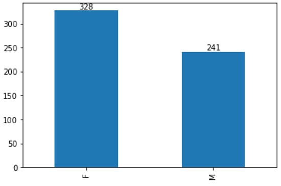 In this section, statistical analysis was carried out to understand the data and the underlying patterns. Statistical analysis aids in determining the pre-processing methods that should be used to prepare the data for modeling. The data used in this study consisted of numerical features and only one categorical feature. The numerical attributes of the data were analyzed using well-known statistical metrics. The numerical properties of the data and their accompanying statistical breakdown are shown in Table 2. As the table demonstrated, the big difference between the 75th quartile and the maximum values indicates the presence of outliers and skewness in some features. Moreover, Figure 2 displays the value count of the gender attribute after removing the duplicates in the pre-processing stage.
