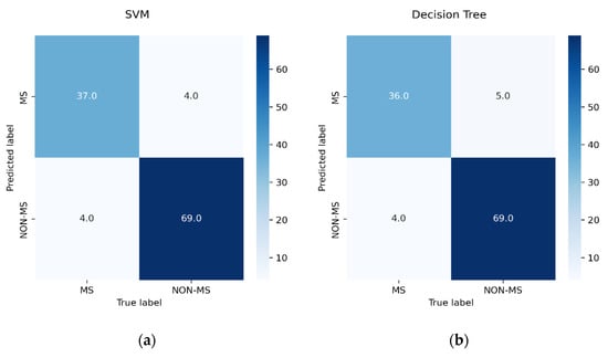 Figure 3 reveals that the ET model, which achieved the fewest FNs (two), is the best algorithm for predicting unwanted occurrences of the targeted disease, followed by the RF and XGBoost models, which failed to classify three cases of MS. Meanwhile, ET, XGBoost, LR, and SVM achieved the lowest rates of FP. Misdiagnosis of MS may occur due to pressure to deliver a timely diagnosis, as several alternative diagnoses may mimic MS, such as functional neurologic disorders, migraines, and arterial disease []. The misdiagnosis of MS could lead to serious repercussions, including losing the chance for early treatment and possibly accelerating the course of the condition. Moreover, the risk of prolonged, unnecessary healthcare hazards and death is often attributed to misdiagnosed MS patients []. To determine the best-performing model, the lowest FN and FP values must be achieved. Therefore, it is concluded that the ET outperforms all other models for the pre-emptive diagnosis of MS.