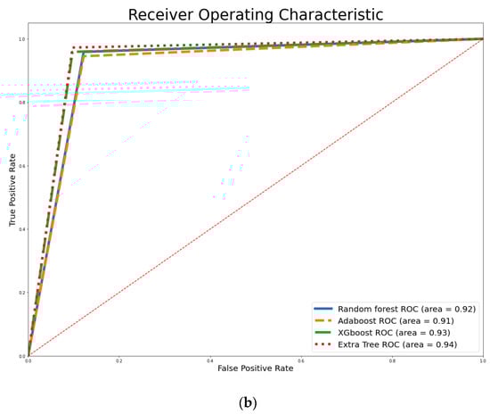 Figure 4 illustrates the Receiver Operating Characteristics (ROC) curve that evaluates the discrimination ability of the classifiers with different thresholds. Accordingly, Figure 4 reveals that the AUC values for the executed classifiers ranged from 0.91 to 0.94. However, XGBoost and ET achieved the highest values at 0.93 and 0.94, respectively.