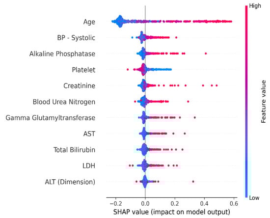 Figure 5 reveals that the high values of all features, except platelets, strongly influence the prediction, whereas their low values negatively influence the positive prediction. Overall, features including “Age”, “BP- Systolic”, and “Alkaline Phosphatase” have significant importance in model prediction, whereas those including “ALT (Dimension)” and “LDH” have a slight effect in comparison to other features.