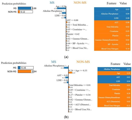 The positive probability prediction generated by the ET model, shown in Figure 6a, was 88%. The figure reveals that features including “Age”, “Alkaline Phosphatase”, and “LDH” contributed to the correct classification of the model for pwMS. Contradictorily, Figure 6b explains the negative prediction generated by the ET model, where the negative probability prediction was 84%. The figure reveals that all features except for “Alkaline Phosphatase”, “AST”, and “LDH” have contributed to the correct prediction of non-MS patients.