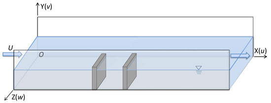 The flow through NDSDs for this study is described in Figure 1. Two identical spur dikes are placed perpendicular to the shoreline and ipsilateral on the horizontal bed. The mean velocity of inflow is denoted U, and the coordinate is X along the flow direction, Y along water depth, and Z along the cross section. The governing equations of standard Model for incompressible viscous fluid can be expressed as [29]: