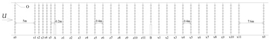 Verification data obtained from the flume experiment were collected with the multifunction flume of 50 m long, 1.2 m wide, and 1.4 m high at Jiangong Test Hall of Zhejiang University, China [19,21]. The spur dikes were made of plexiglass into 1.6 cm thick, 40 cm high, and 30 cm long. The water level was controlled at 0.3 m, and the flow rate of inflow was 0.058 m3/s to generate subcritical flow (the supercritical flow around spur dike may result in the break wave and not considered here). Nortec Vectrino Acoustic Doppler Velocimeters (ADVs) were used to measure velocities, and wave height meters for water surface elevations [19,21]. The distribution of measured cross-sections and points are shown in Figure 2. Initial cross-section s0 is at the inlet. Spur dike 1 (SD1) is at cross-section A, 6 m from the upstream inlet (20 times the length of spur dike); spur dike 2 (SD2) at cross-section B, 12 m from the downstream outlet (40 times the length of spur dike). Such a distance can eliminate the influence of the boundary on the results. There are 5 cross-sections (s1–s5) at the upstream of SD1 with equal spacing of 0.2 m; 11 cross-sections (z1–z11) between SD1 and SD2 with equal spacing of 0.4 m; and then 11 cross-sections (x1–x11) along the downstream of SD2 with equal spacing of 0.4 m. The outlet cross-section x0 is 7.6 m from cross-section x11. The total numbers of measured cross-sections and points are 31 and 341, respectively. The coordinate origin is arranged at the bottom of flume at the point O in Figure 2. With the reference of the flume experiments, the geometry dimension for numerical model is 22.8 m long, 0.3 m high, and 1.2 m wide, in which the total grid number is about 150,000 under the mesh size of ΔX = 0.20 m, ΔY = 0.04 m, ΔZ = 0.05 m, and grid refined within 1 m around the spur dike.