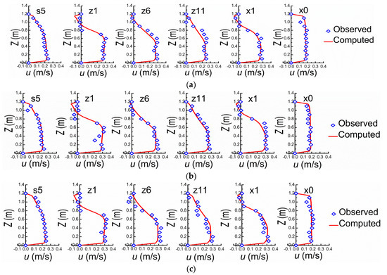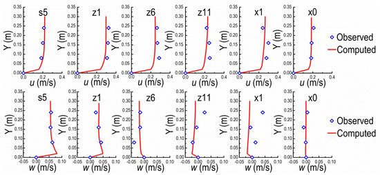 Sections of s5, z1, z6, z11, x1, and x0 are selected to verify the mathematical model (Figure 2). The mean velocities at inlet cross-section in X, Y, and Z directions are respectively set according to the observed data from flume experiment. It should be pointed out that all velocities in this study are time-averaged velocities except the fluctuating ones used for estimating the turbulence intensity herein. The comparisons between the observed and computed results are shown in Figure 3 and Figure 4, in which the verifications of velocities (v) are ignored due to the small magnitudes comparing to u and w. For u and w along Y on the central axis of flume at different verification cross-sections, the comparisons between observed and computed are shown in Figure 3. The comparisons of u along Z direction between observed and computed values on different horizontal planes (Y = 0.08, 0.16, and 0.24 m) are shown in Figure 4. In general, the experimental and computational data agree well. It should be pointed out that the measured data may themselves be subject to measurement error and expand on what these might be, i.e., it cannot be guaranteed that each and every measurement is accurate. The numerical model can be used for subsequent investigation on the structure characteristics of the flow field around NDSDs and their interaction laws. The verification performance of w, however, is relatively worse than u, because of the comparatively small magnitude.