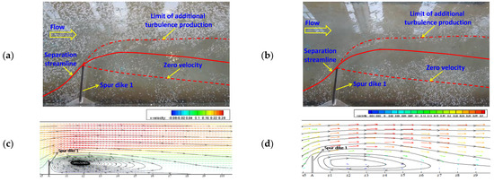 The flow structure near spur dike 1: (a) surface image in initial stage of visualization, (b) surface image in last stage of visualization, (c) numerical result on the horizontal plane of Y = 0.08 m, and (d) experimental result on the horizontal plane of Y = 0.08 m.