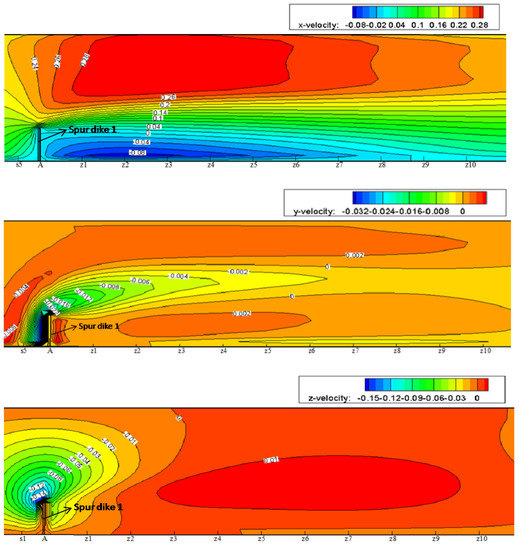 The flow structure can usually be classified into three types, i.e., micro-flow, meso-flow, and macro-flow according to hydraulic research scale. Concerning the micro-flow, attention is paid to the water movement at molecule level; and for the meso-flow structure, we are more interested in flow characteristics of turbulence; while dealing with the macro-flow, more attention is focused on the flow process in natural scale and the mean flow parameters in time series. In this study, the flow type belongs to the macro-flow structure. The simulation results of the verification condition are subsequently used to analyze the flow patterns of NDSDs. Figure 5a,b respectively show the surface patterns in the initial and the last stages of the visualizing test. A flow separation zone around the spur dike similar to the result of Ettema and Muste [34] could be observed. Velocity vectors and stream lines are presented to compare experimental and numerical results (see Figure 5c,d). Due to the water-blocking, deflecting, and narrowing effects of the spur dike, the flow velocities decreased and the flow developed into the backflow zone at the upper corner of the spur dike; on the other hand, the mainstream was detoured and deflected toward the other side of flume with the increase of flow velocities as well as the deflection of mainstream extending for a long distance. Meanwhile, the downstream backflow zone appeared at the lower corner of the spur dike because of flow separation. After surpassing the downstream backflow zone, the mainstream entered recovery zone and was gradually restored. Figure 6 presents the velocity contours in X, Y, and Z directions near SD1. The contour profile of u is similar to the streamline distribution. The negative velocity curves of v from the upper corner of spur dike extend downstream along the dike tip, and restore gradually, which stretched in a shuttle shape. Taking the dike tip as source point, the negative velocity distribution of w radiates outward and decreases gradually. In terms of the velocity restoring process, it presents the slowest in the X-direction but fastest in the Z-direction which indicates that the velocity u plays a dominant role to form the flow pattern of NDSDs, while the v and w affect the shape and internal structure of the backflow zone.